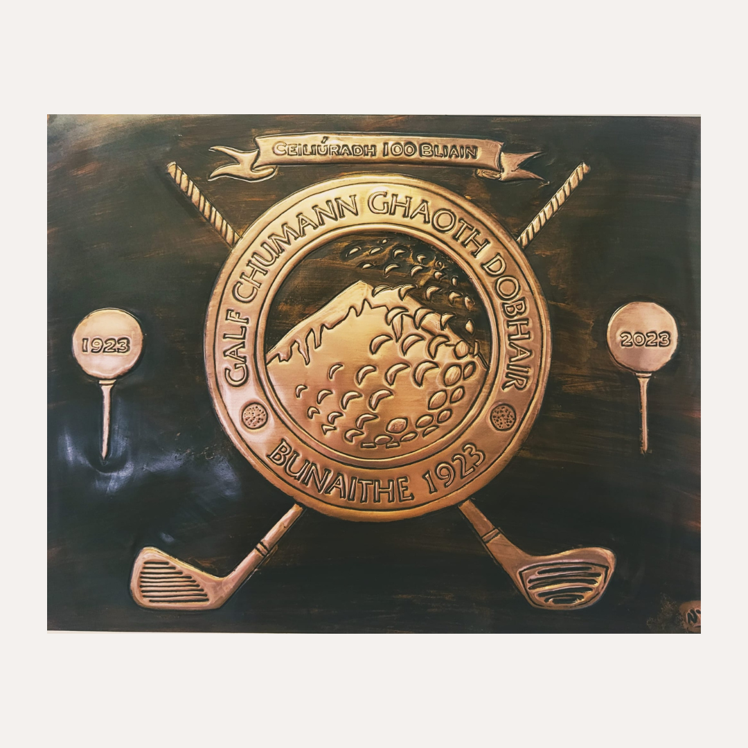 Handcrafted in copper, this commemorative piece celebrates 100 years of Gweedore Golf Club, founded in 1923. Featuring the club crest, golf clubs, and tees, it honours a century of sport, community, and Donegal heritage.